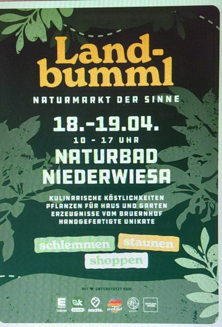 Am 18. / 19.04. sind wir auf dem Naturmarkt "Landbumml" in Niederwiesa von 10 - 17 Uhr mit Artikeln aus unserem Sortiment